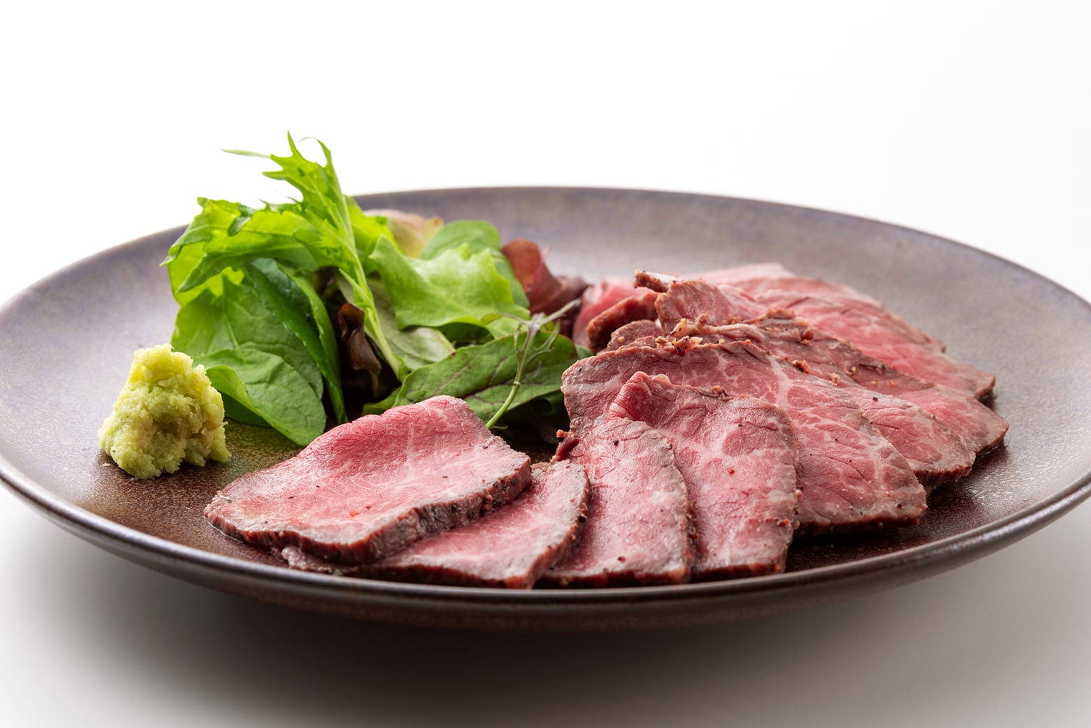 創業以来「黒毛和牛」の肥育に取組み、平成7年から牛の疲労回復とストレス軽減のために「はちみつ」や「はちみつパウダー」を混ぜこんだ飼料や「岩塩」を与えることにより、健康で肉質が甘い黒毛和牛で作った牛肉100%のローストビーフ。