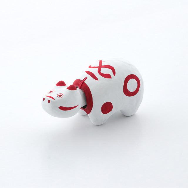 丸いおしりのシルエットと背中のデザインが特徴の赤べこ。背中の鞍をあらわす文様は柳津(やないづ)町の「や」の文字を崩したもの。
