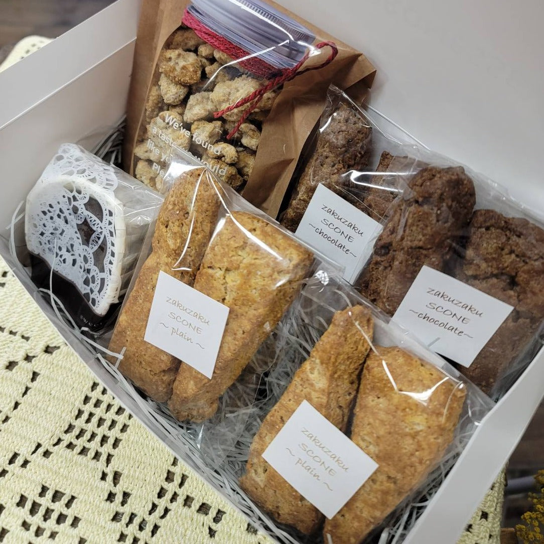 クルミのプラリーヌ×1個/全粒粉とキビ糖のスコーン(2本入り)×2個/チョコチップのスコーン(2本入り)×2個/ガトーショコラ×1個