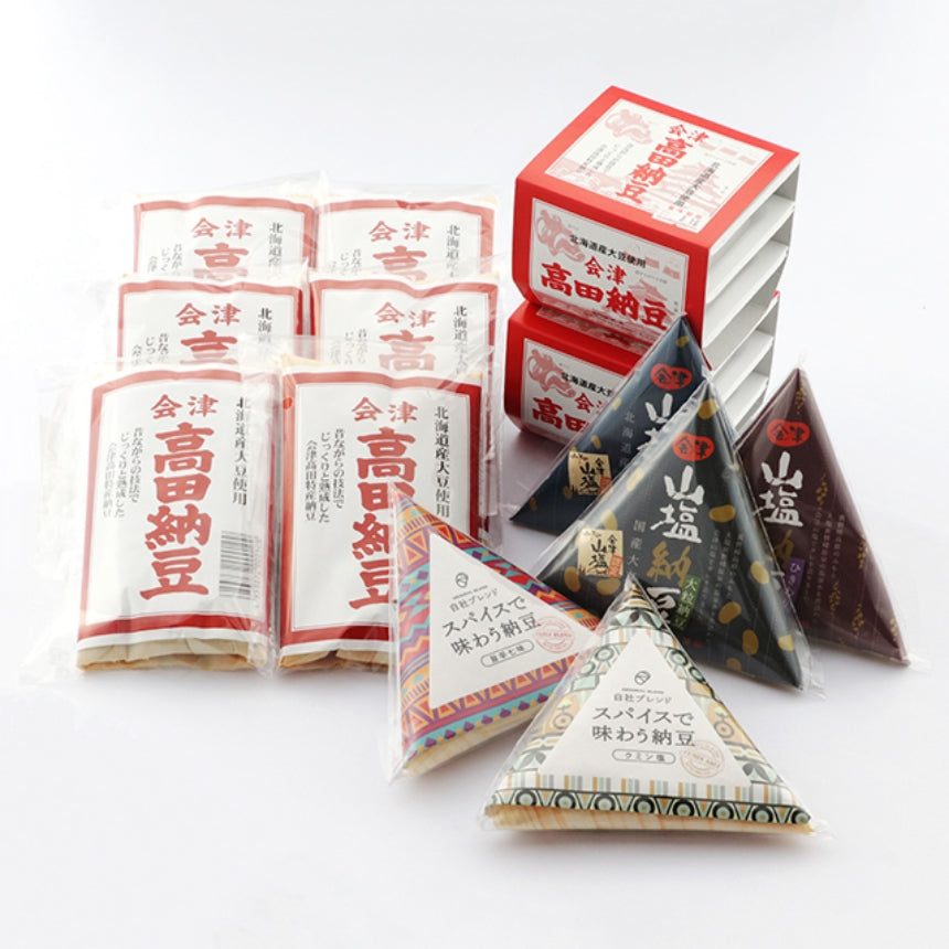会津山塩の塩味でいただく「山塩納豆」、シェフ監修「スパイスで味わう納豆」の詰め合わせ。